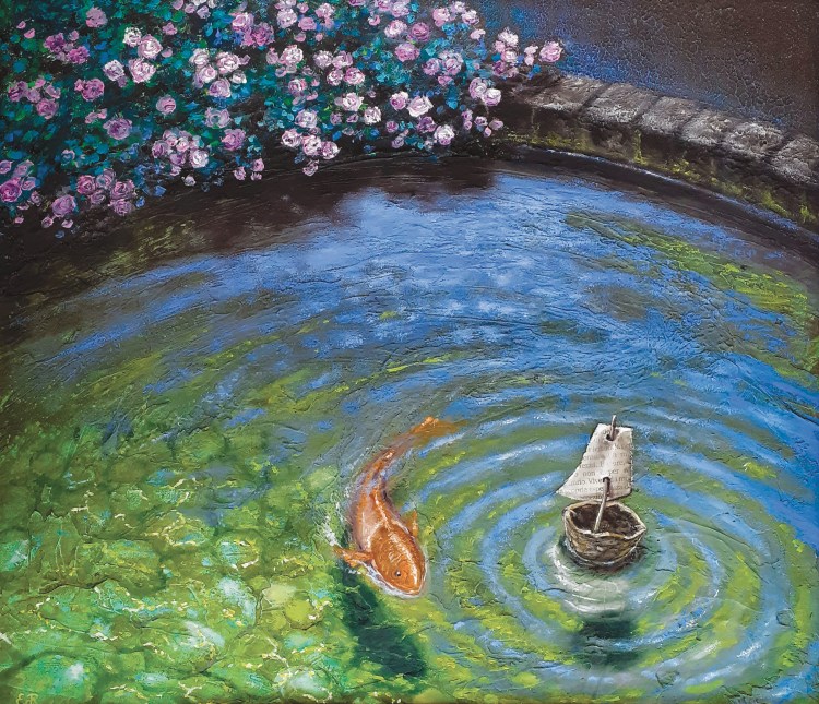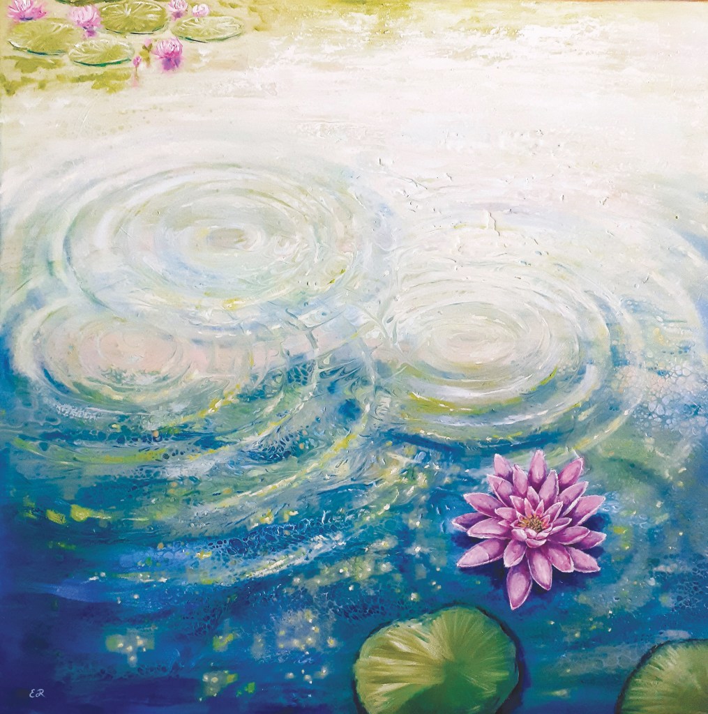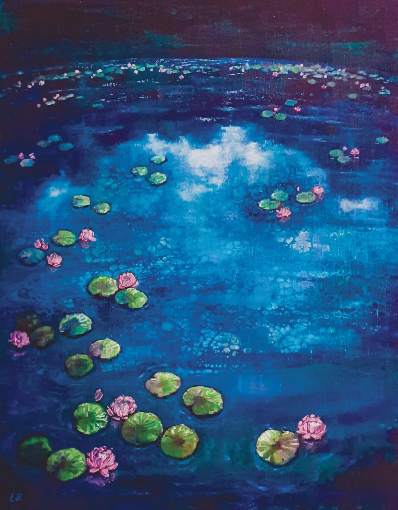 Cercare di dipingere l’acqua con i suoi riflessi è sempre una sfida, ed il confronto con i capolavori di Monet è sempre inevitabilmente ed impietosamente dietro l’angolo…