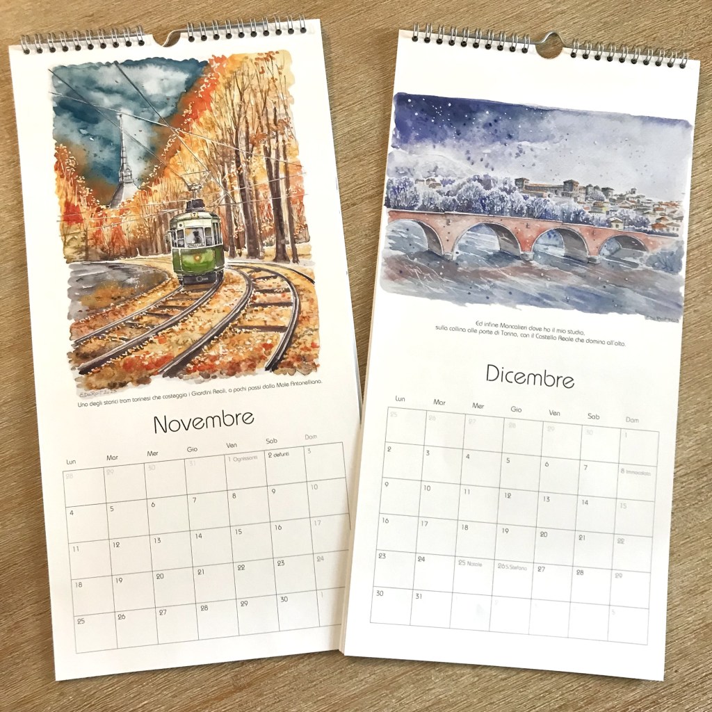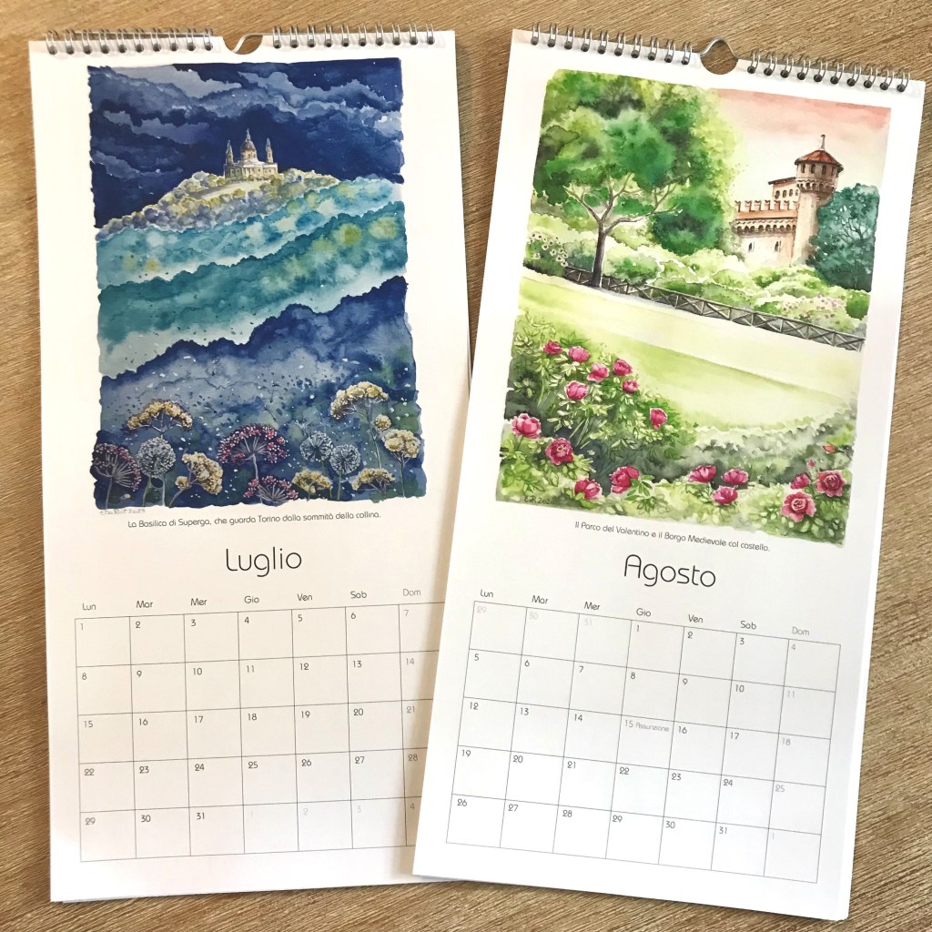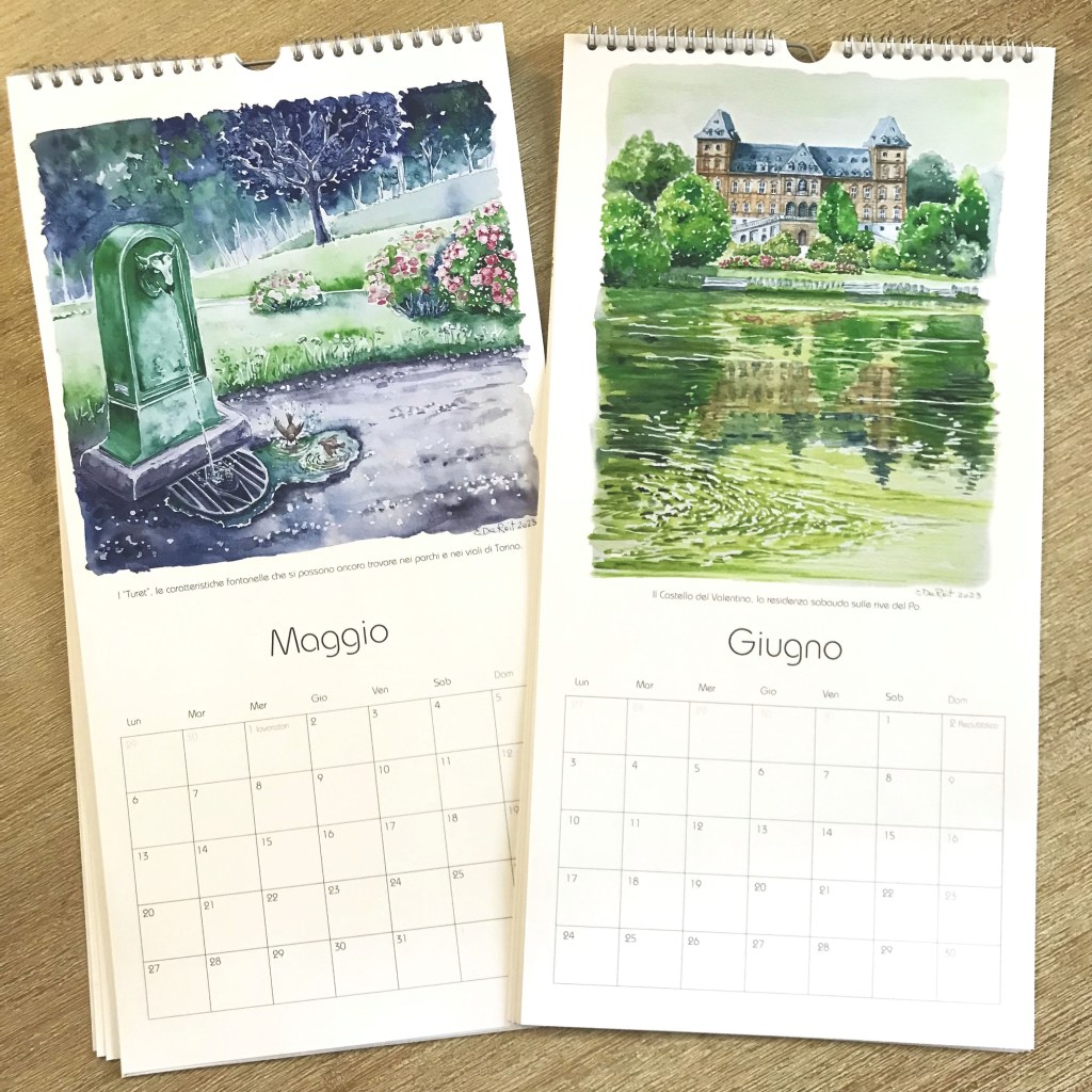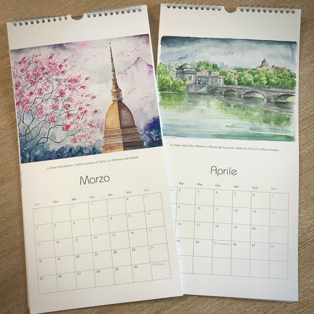 Ogni mese è illustrato con uno dei miei acquerelli ispirati da alcuni dei luoghi più iconici di Torino e dei dintorni.