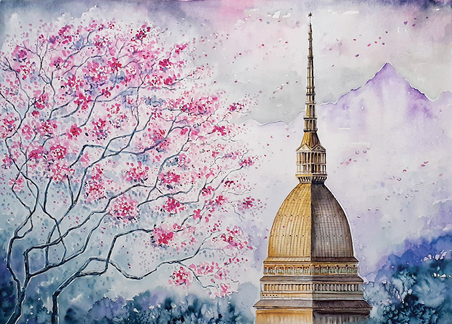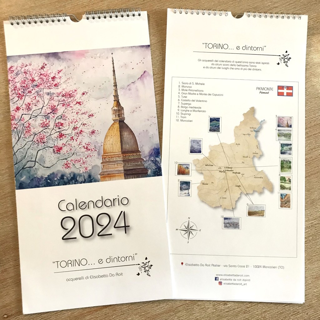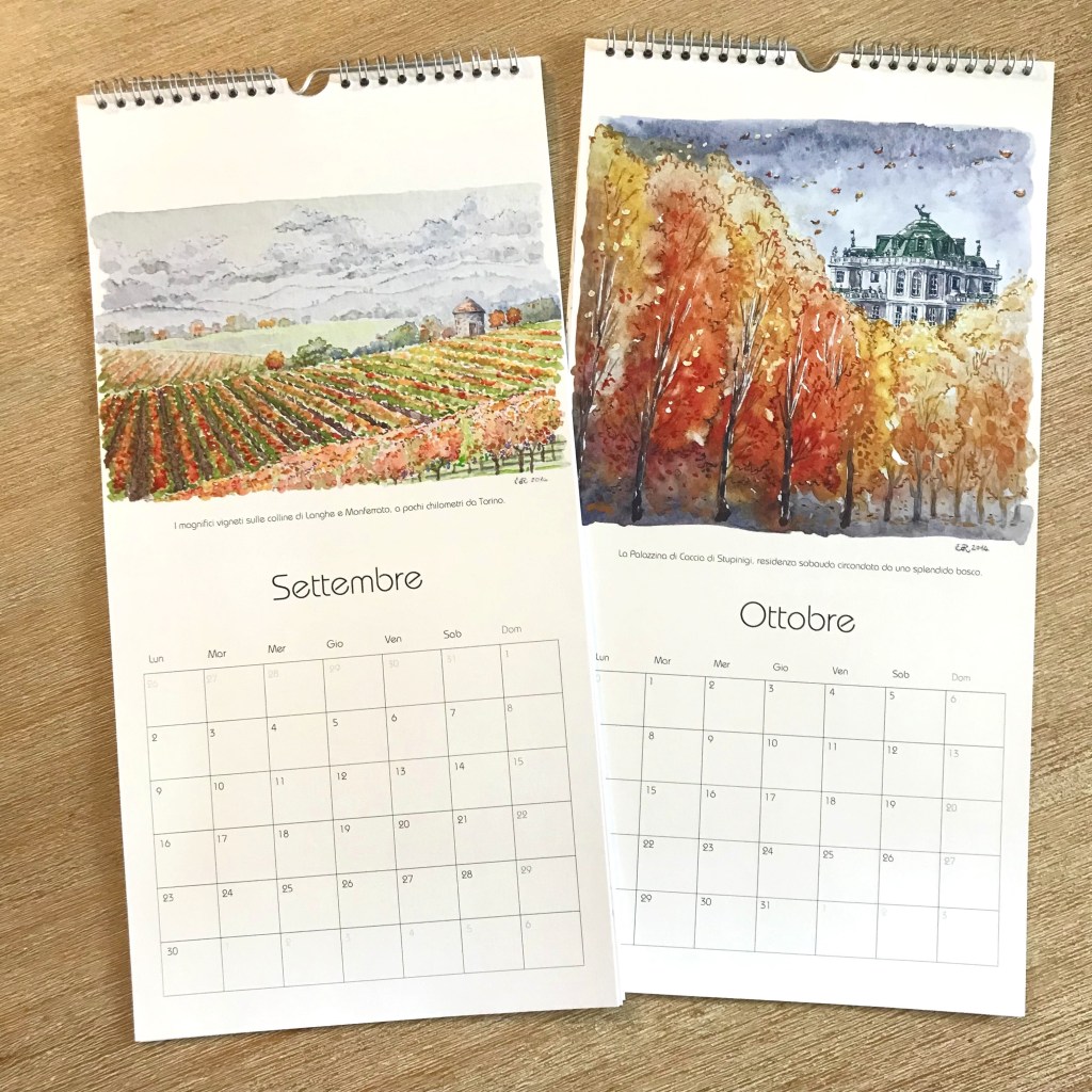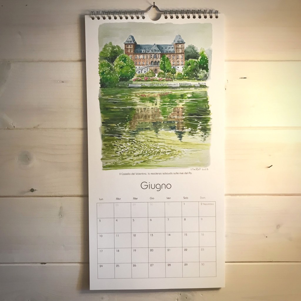 Ogni mese è illustrato con uno dei miei acquerelli ispirati da alcuni dei luoghi più iconici di Torino e dei dintorni.